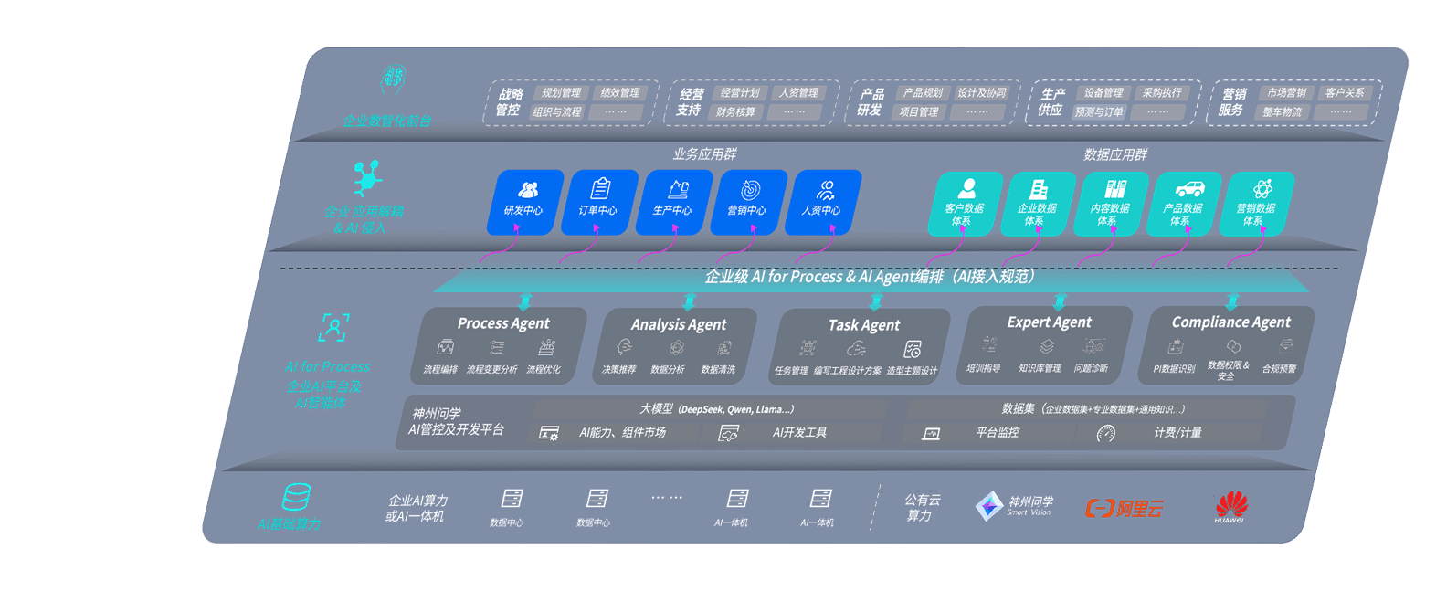 端到端的一站式AI工作空间深度融合了从企业战略规划到日常经营的全流程业务板块,,,定向解决车企内部领域多、、、、部门多、、、、链条长、、场景碎片化等难题,,,,支持车企快速构建以AI为核心的生产力写作体系,,,,实现任务执行与AI能力的无缝集成与交互