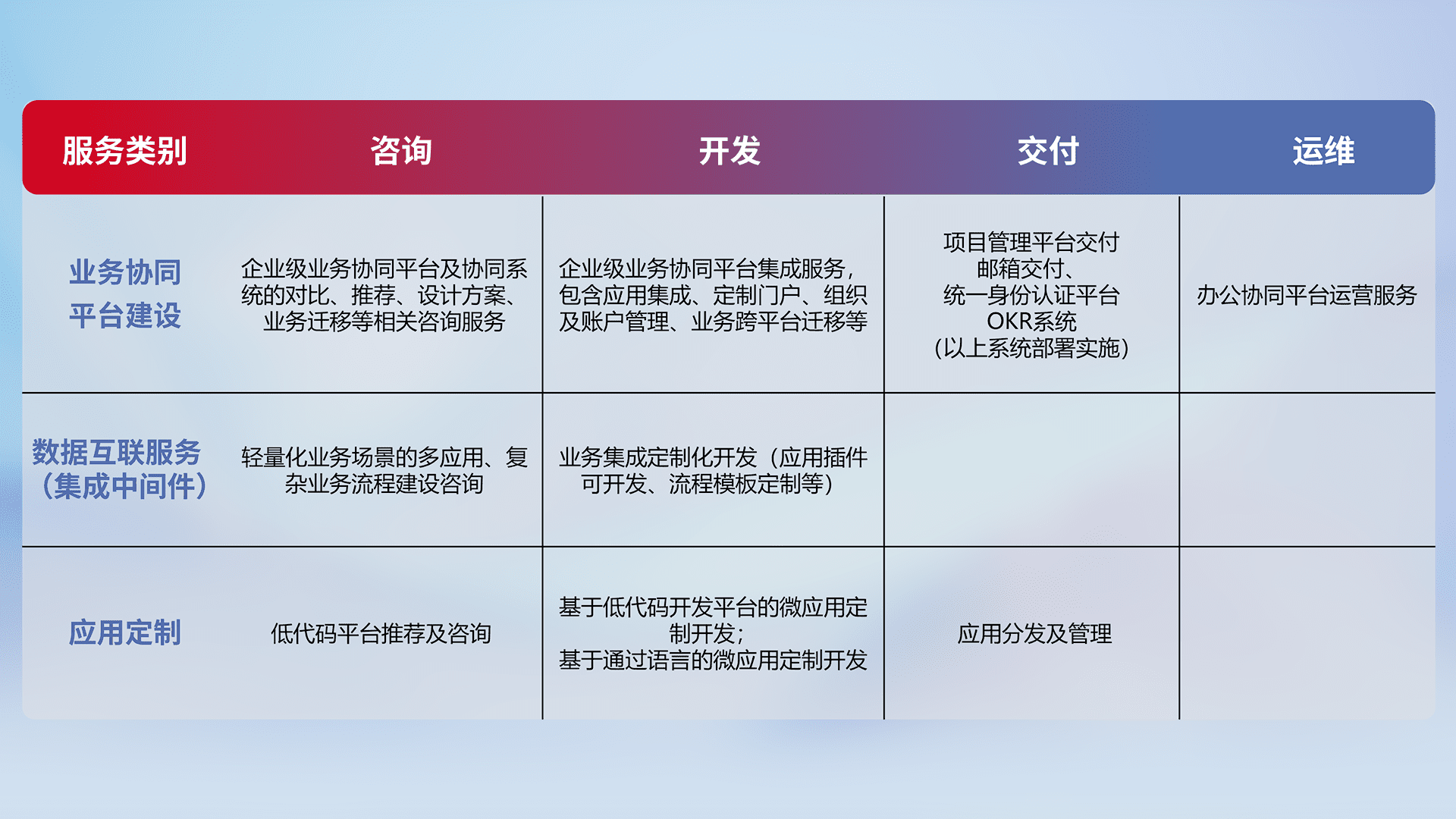 针对钉钉、、企微、、、、IDaas等平台级产品提供产品的规划、、、、方案、、、交付、、、、定制化开发等服务,,,实现如统一协同办公、、智能客户服务、、、混合会议管理、、、智能数据查询、、、等业务场景,,,,实现数字化转型。。
