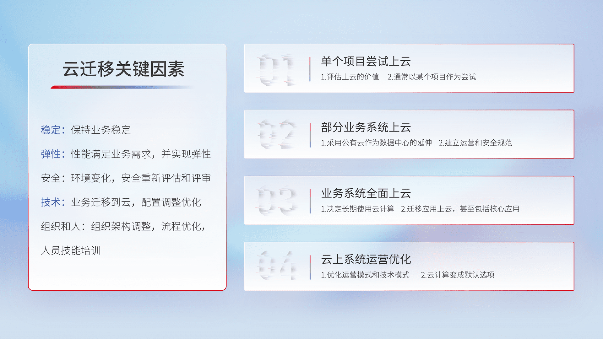 结合实际业务,,,从规划设计、、云平台选型、、、云原生改造、、数据迁移、、、、集成交付,,,,迁移全过程为客户识别最佳上云路径,,做好风险识别管理,,设计网络架构、、、身份权限、、、、安全审计合规、、操作审计、、、日志审计、、、、监控告警策略、、、多站点容灾设计等,,,对云上基础设施进行整体规划,,,提升IT治理水平,,,,以满足弹性、、高可用、、、高性能的需求。。
