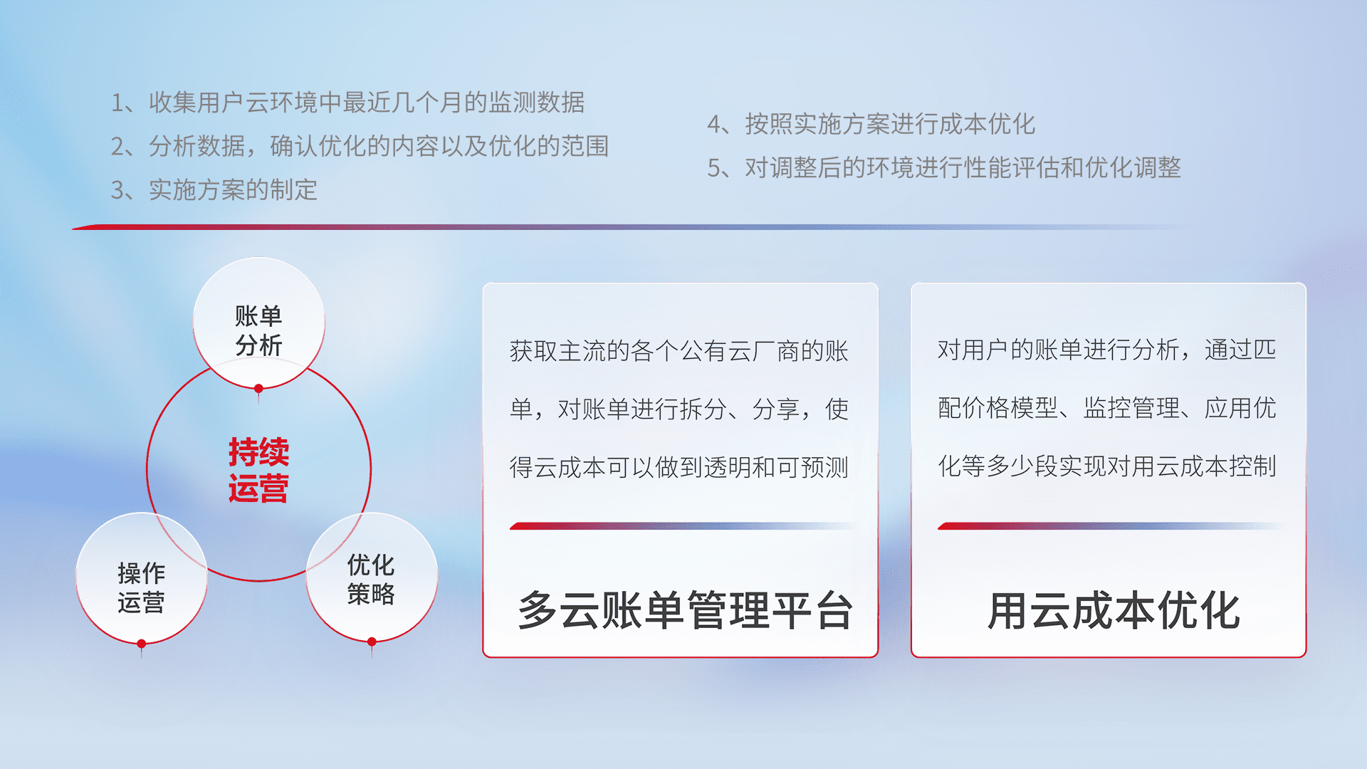 通过多云纳管,,以统一的资源数据模型把客户的云资源进行抽象和封装,,,进而实现对多云资源的统一操作,,保障云资源管理的可靠性、、稳定性与可用性。。。。量身定制化运维内容,,,,配置、、开发运维、、、、补丁管理、、、备份、、、监控、、认证和访问管理、、审计和日常巡检等,,,,保障在用云过程中的可靠度,,,,稳定度以及高可用率。。