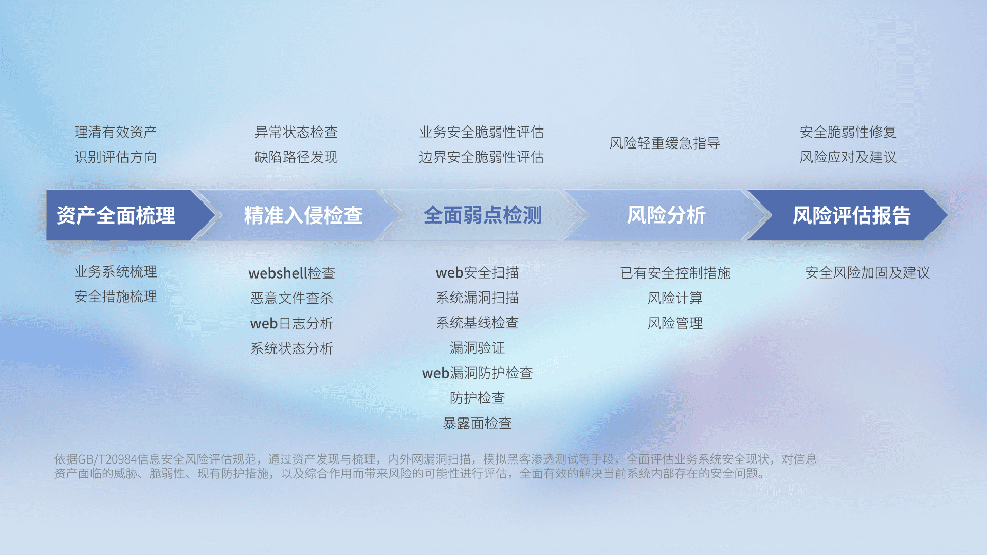针对客户行业特性,,,,以专业的安全服务+多厂商联合解决方案提供专属的一站式安全管理服务,,帮助客户全面感知网络空间威胁,,,基于识别、、、、检测、、分析、、、、防护、、、监测、、、响应的服务理论模型,,,从方案咨询、、、、集成交付、、、、评估验证、、优化加固、、运维运营,,致力于为客户提供完整的闭环管理式安全服务。。以实战经验为客户打造高抵御风险的安全体系,,,,帮助客户发现威胁、、对抗威胁、、、处置威胁,,,不断积累安全对抗能力,,,,持续保障数字化安全。。。